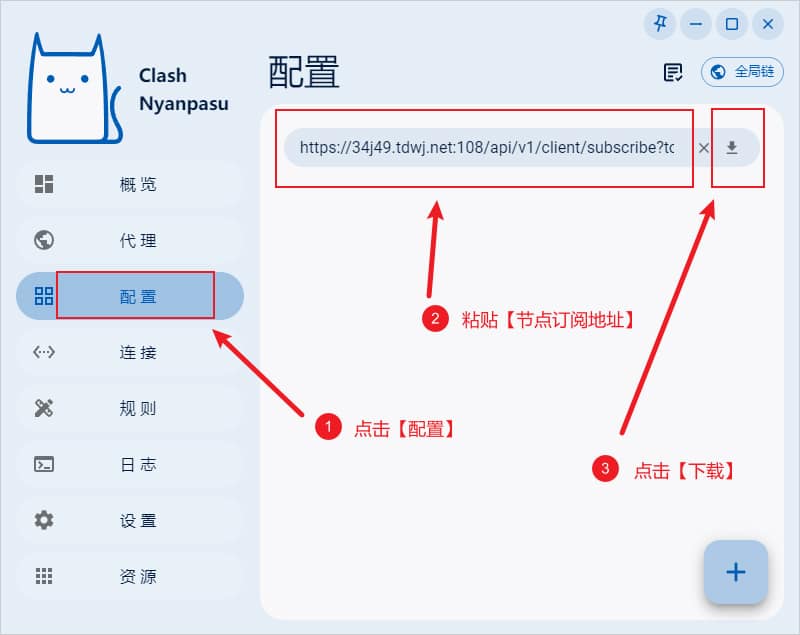 从机场获取URL订阅节点之后,然后点击界面左侧菜单 配置,在顶部输入框填入刚才复制的 URL 连接地址并点击 下载图标 即可,下载完成后点击对应的配置文件即可添加配置文件,如下图所示。