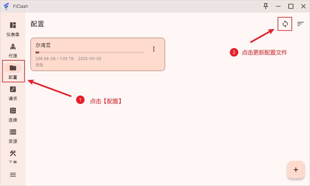 从机场获取URL订阅节点之后,然后点击界面左侧菜单配置,点击右下角➕键,如下图所示。